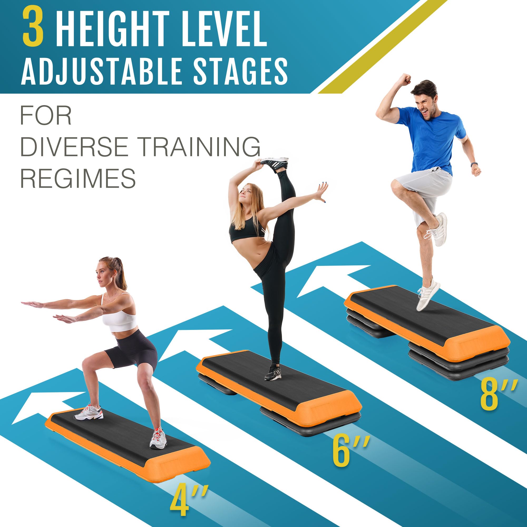 - [Flexible Height Adjustment to Meet Your Workout Needs] This exercise step platform features three height settings (4, 6, 8 inches), easily adapting to various workout intensities. Whether for basic workouts, fat loss, or muscle building, this platform allows you to adjust the challenge as needed